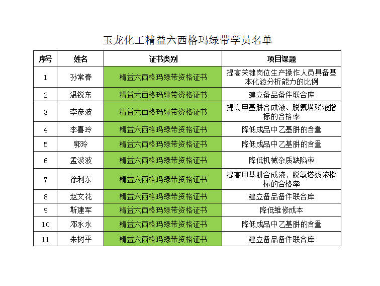 玉龍化工首期精益六西格瑪綠帶培訓(xùn)圓滿結(jié)束